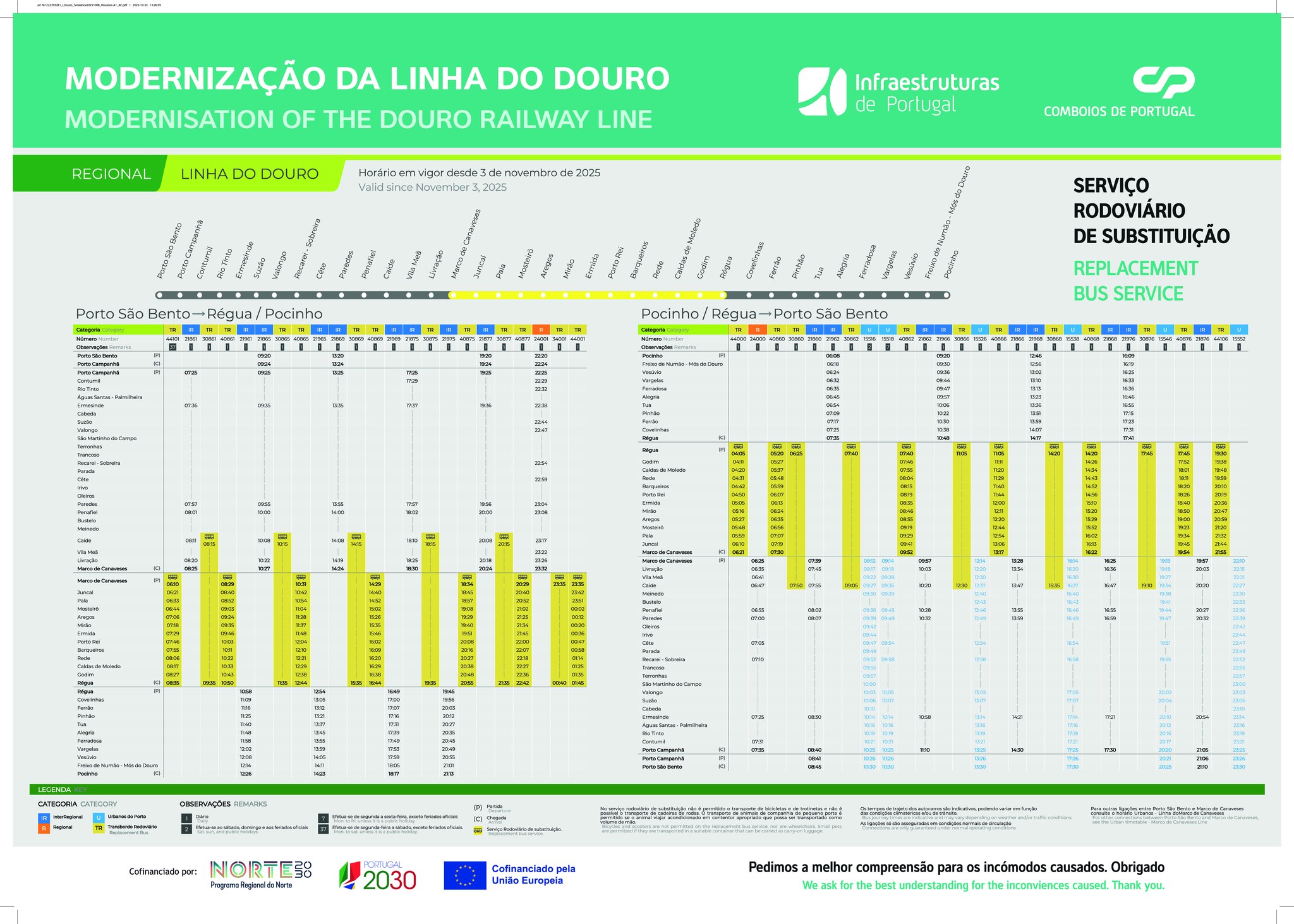 De , o troço do Marco de Canaveses e o Peso da Régua estará encerrado porque a Infraestruturas de Portugal (IP) e a Comboios de Portugal (CP) irão proceder a uma intervenção profunda na Linha do Douro. Esta paragem é indispensável para as ̧̃, reforço de túneis e estabilização de taludes. Um passo fundamental para uma linha mais segura, rápida e ecológica.